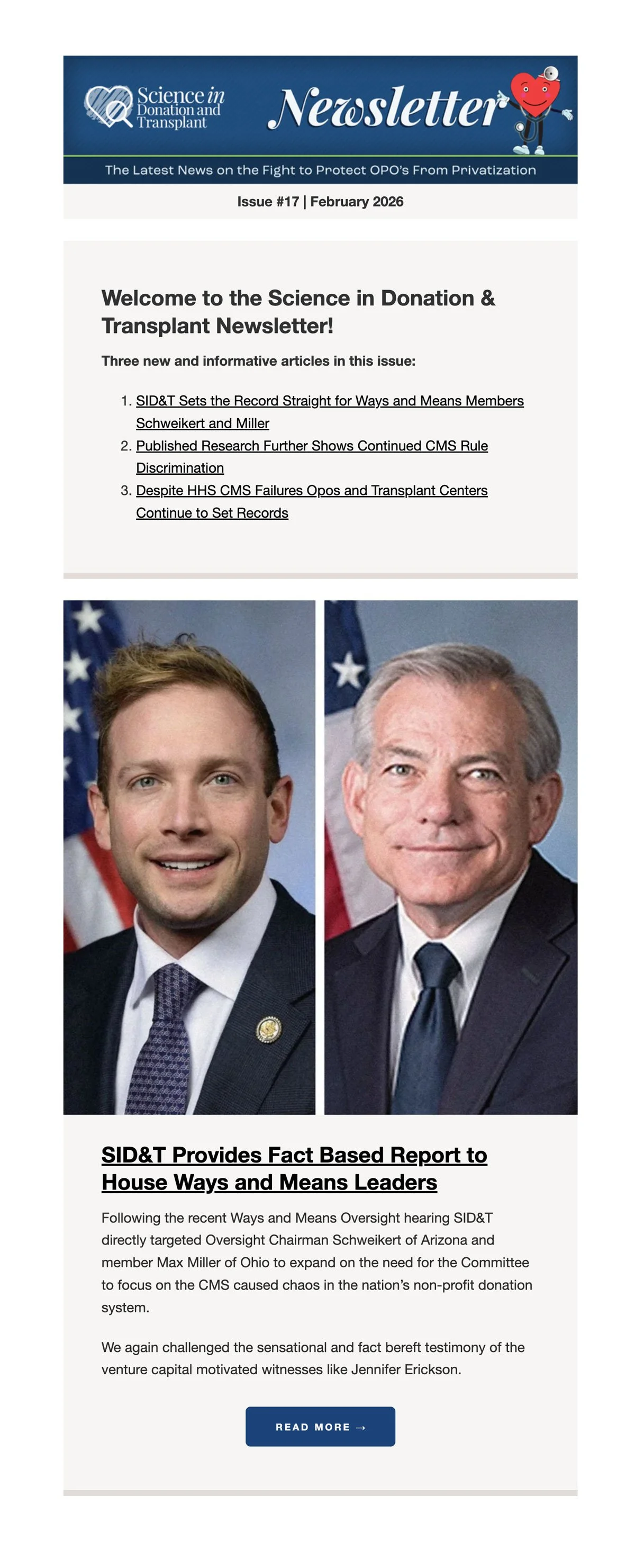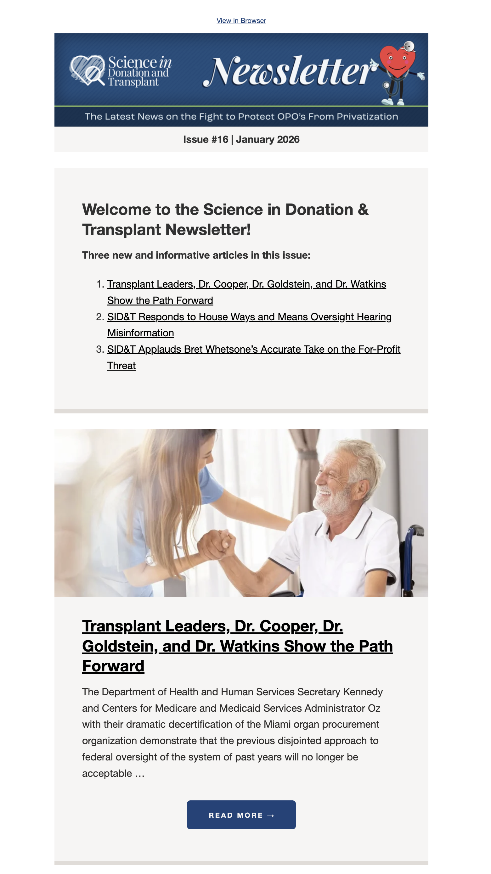 The SID&T Newsletter is a timely email that includes the latest news on the fight to protect OPOs from privatization, and more. Explore the latest edition, past editions, and sign up to stay connected!