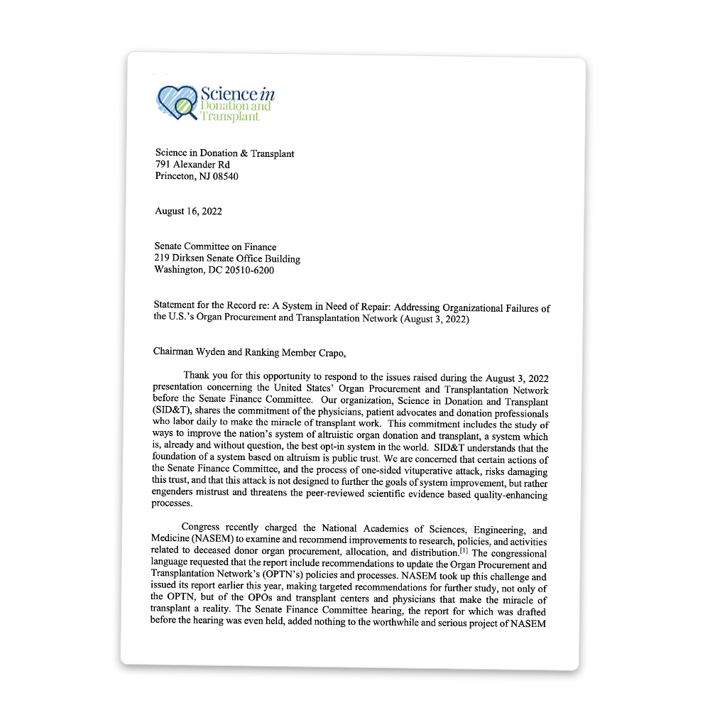 Thank you for this opportunity to respond to the issues raised during the August 3, 2022 presentation concerning the United States’ Organ Procurement and Transplantation Network before the Senate Finance Committee. Our organization, Science in Donation and Transplant (SID&T), shares the commitment of the physicians, patient advocates and donation professionals who labor daily to make the miracle of transplant work. This commitment includes the study of ways to improve the nation’s system of altruistic organ donation and transplant, a system which is, already and without question, the best opt-in system in the world. SID&T understands that the foundation of a system based on altruism is public trust. We are concerned that certain actions of the Senate Finance Committee, and the process of one-sided vituperative attack, risks damaging this trust, and that this attack is not designed to further the goals of system improvement, but rather engenders mistrust and threatens the peer-reviewed scientific evidence based quality-enhancing processes.