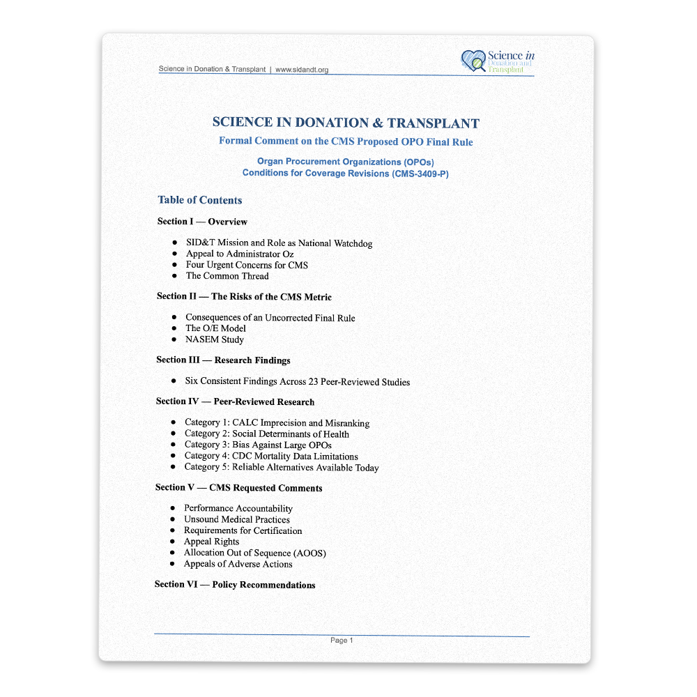 In this comment, Science in Donation & Transplant (SID&T) will address the many troubling elements in both the 2020 CMS Final Rule and in the latest organ procurement proposed rule: CMS Proposes Rule to Strengthen Oversight of Organ Procurement Organizations and Protect Patients. To support patients on the transplant waiting list, the selfless organ donors and their families, we urge CMS to base its policies and rules around organ donation and transplantation on evidence-based research.